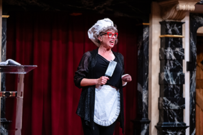 Babich introduces Bennett as an eminent Shakespeare scholar. “Pre-eminent Shakespeare scholar,” Bennett corrects her. Bennett, dressed in black pants, black sheer jacket, and black tennis shoes but red-frame glasses, will endure many elaborate Elizabethan costume changes and resulting bizarre stage business throughout her performance. She follows up on Babich’s biblical reference by proclaiming that Shakespeare’s Complete Works should be placed in every hotel room in America. “Shakespeare is hot!” she proclaims.